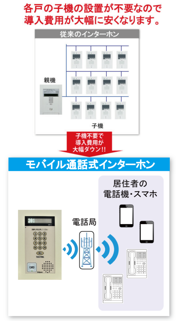 - 来訪者は部屋番号と呼び出しキーを押すと、訪問先に電話がかかります。
